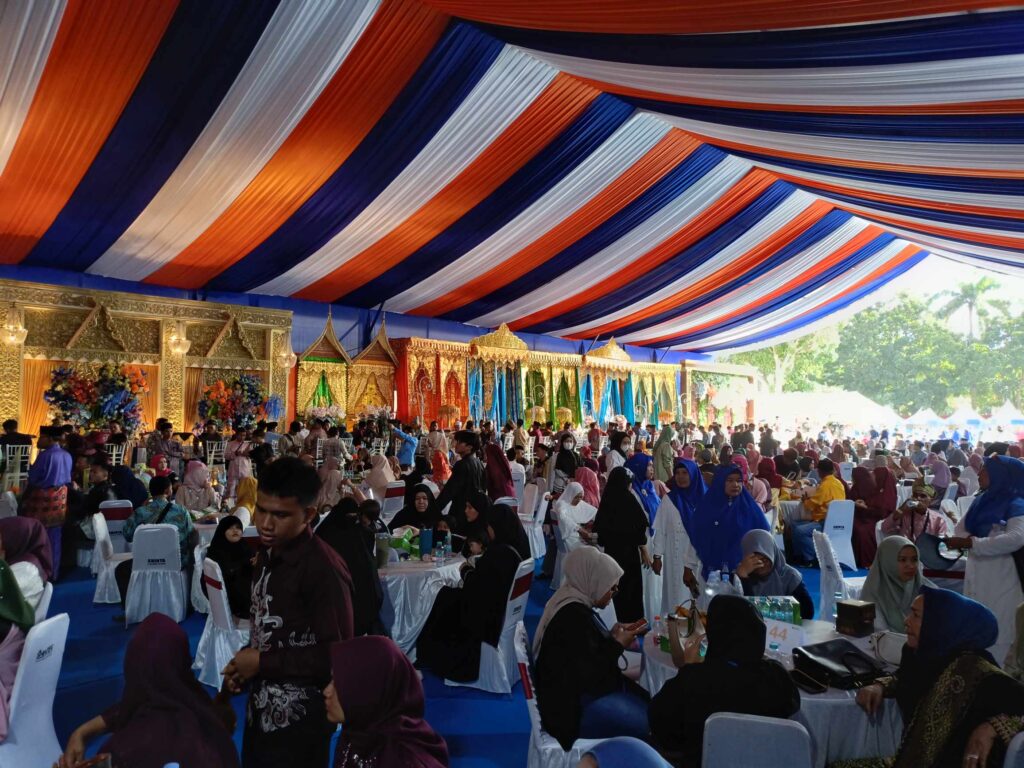 Mereka turut meramaikan kegiatan Nikah Massal Gratis yang digelar Pemerintah Kota Pekanbaru. Masyarakat antusias menyaksikan nikah massal yang diikuti 71 pasang warga Pekanbaru ini.
