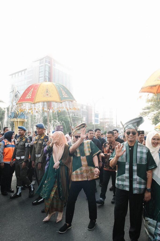 Para calon pengantin mengikuti arak-arakan dari Masjid Agung Ar Rahman, Jalan Jendral Sudirman. Wali Kota Pekanbaru, Agung Nugroho dan Wakil Wali Kota, Markarius Anwar serta pejabat Forkopimda memimpin arak-arakan.